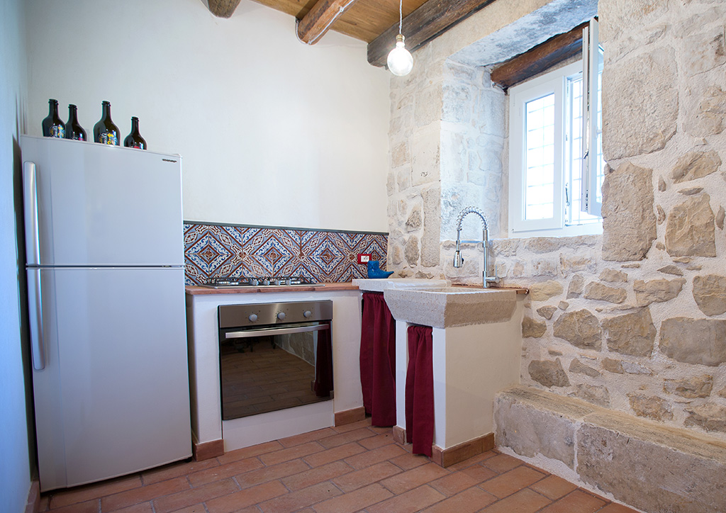L’appartamento è composto al piano terra da anti-bagno, bagno, cucina con quattro fuochi e forno.
